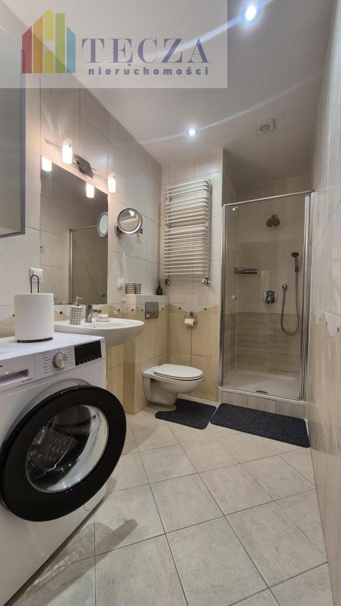 * łazienka z kabiną prysznicową, pralką, umywalką, wc,